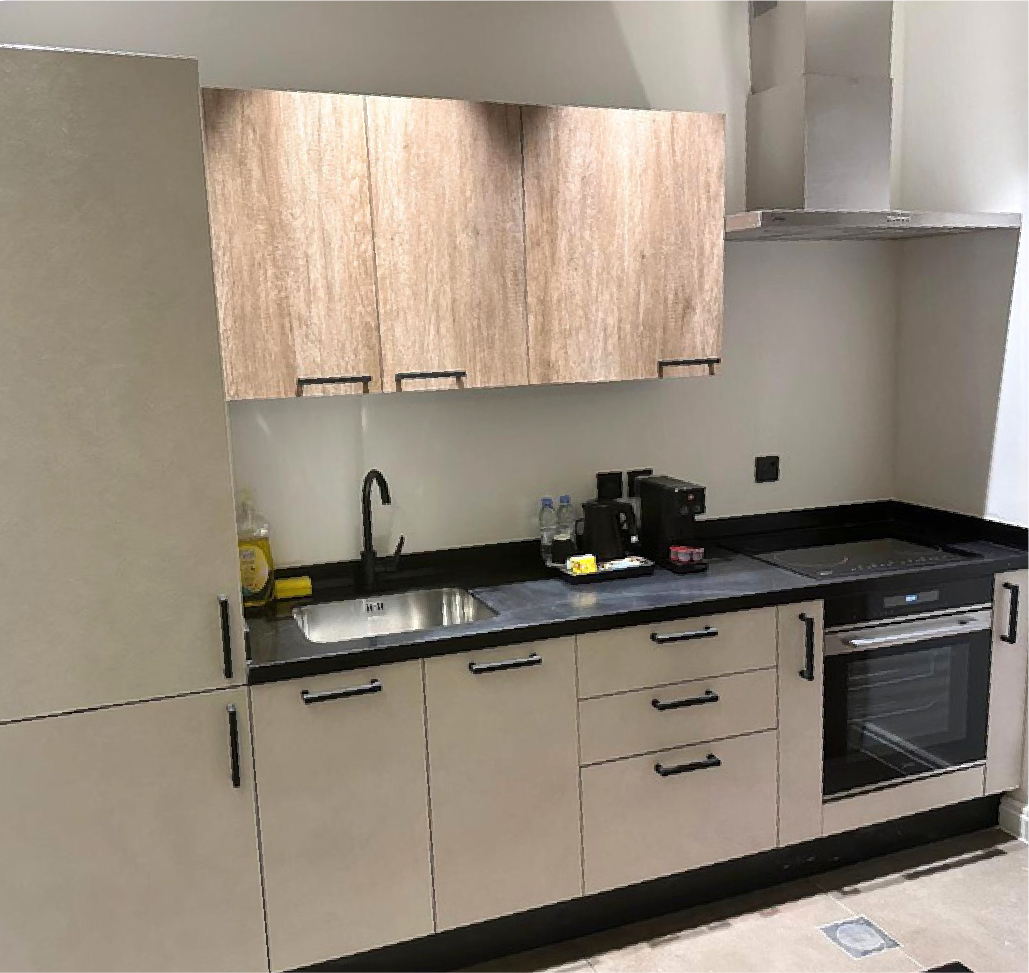 An open-concept suite featuring a combined bedroom and living area, a dining counter, a fully equipped kitchen.